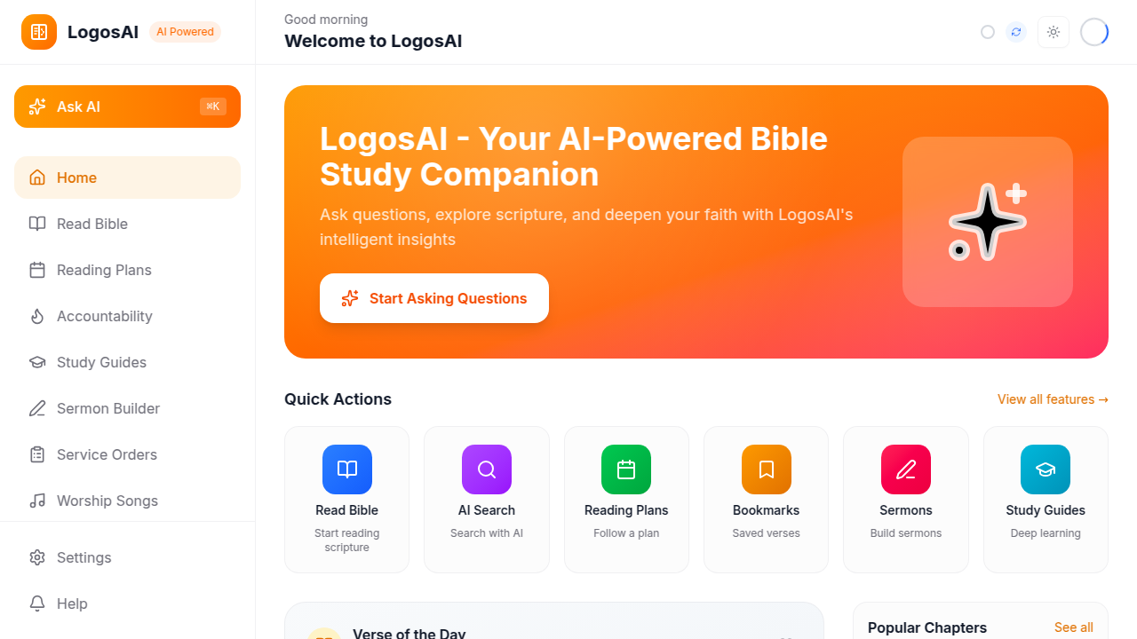What it is: LogosAI is a web-platform for Bible study and spiritual learning: letting you read scriptures, search verses, explore biblical topics and concepts. Main features: Use natural-language questions (e.g. “What does the Bible say about forgiveness?”) to find relevant verses and passages. Get AI-powered study guides, commentary, and thematic overviews to deepen understanding. Bookmark verses, track history, and build a personal library. Supports multiple languages (English, Hindi, “Hinglish”) Purpose: To make Bible-study easier and more accessible — helping believers or curious readers explore Scripture efficiently using AI, while still engaging meaningfully with its content.